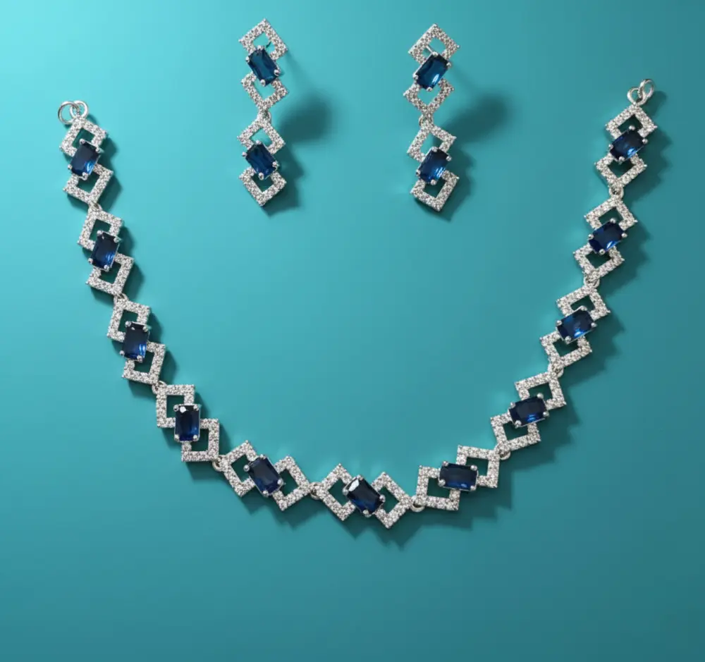 Turn heads with the Blue Sapphire Diamond-Cut Necklace Set by Swarali Fashion, a symbol of elegance and grace. Crafted with precision, this imitation jewellery features dazzling diamond-cut detailing with rectangular blue sapphire stones arranged in a unique geometric pattern.