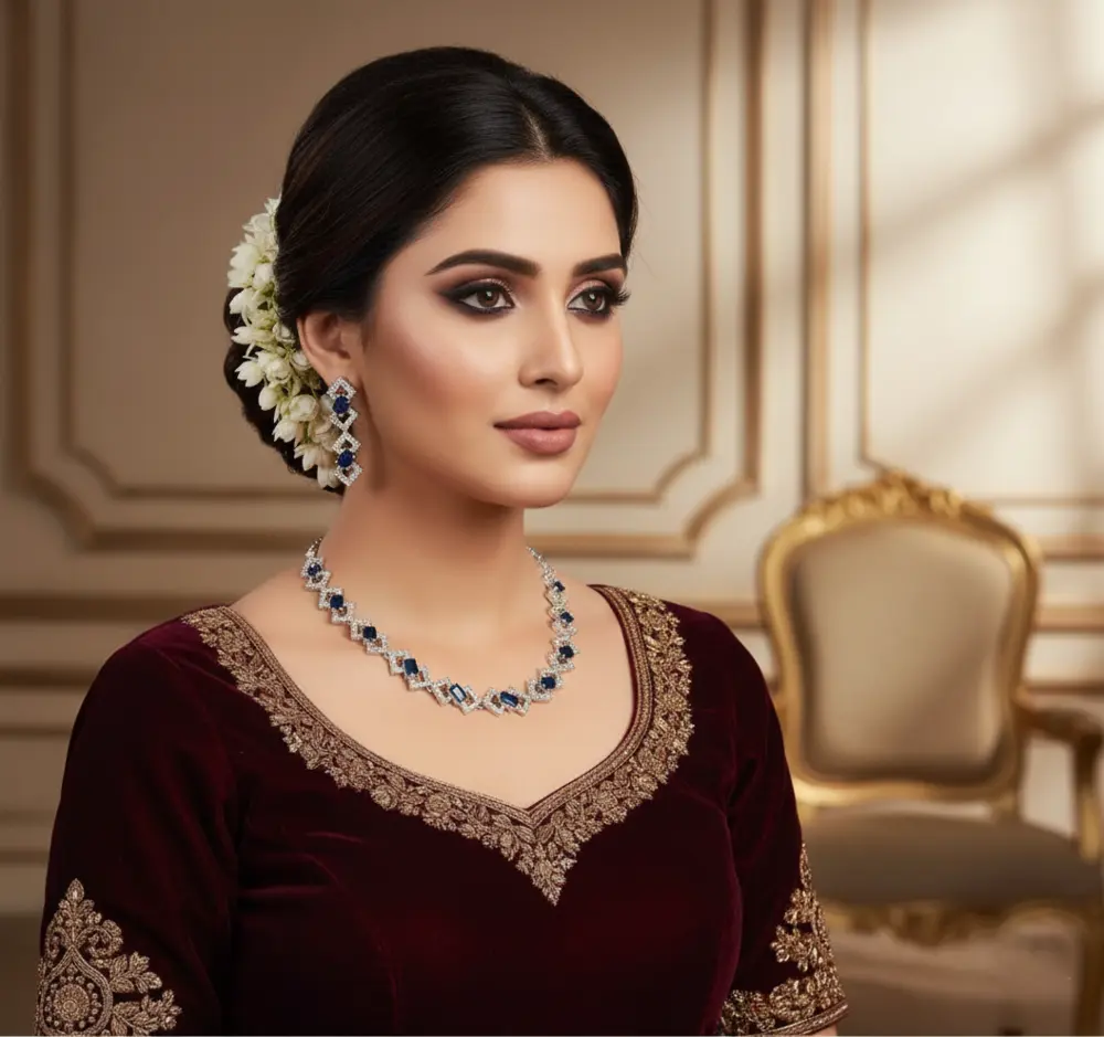 Add a royal sparkle to your collection with this blue sapphire diamond-cut necklace set from Swarali Fashion. Elegant, lightweight, and perfectly paired with earrings — ideal for weddings, festive celebrations, and evening parties.