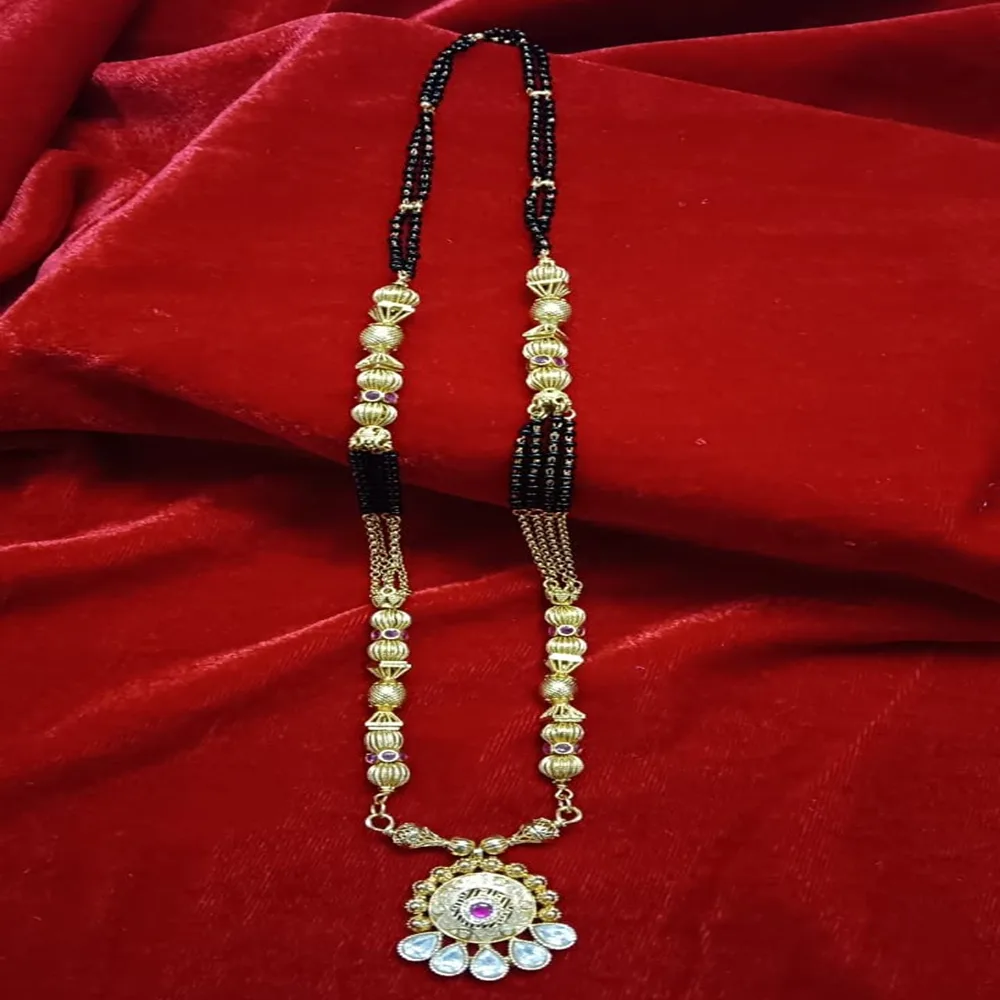 The chain showcases an artistic arrangement of gold-toned beads and black beads, symbolizing purity and eternal love. Its lustrous gold plating and fine detailing make it an excellent choice for festive occasions, traditional ceremonies, or daily wear.