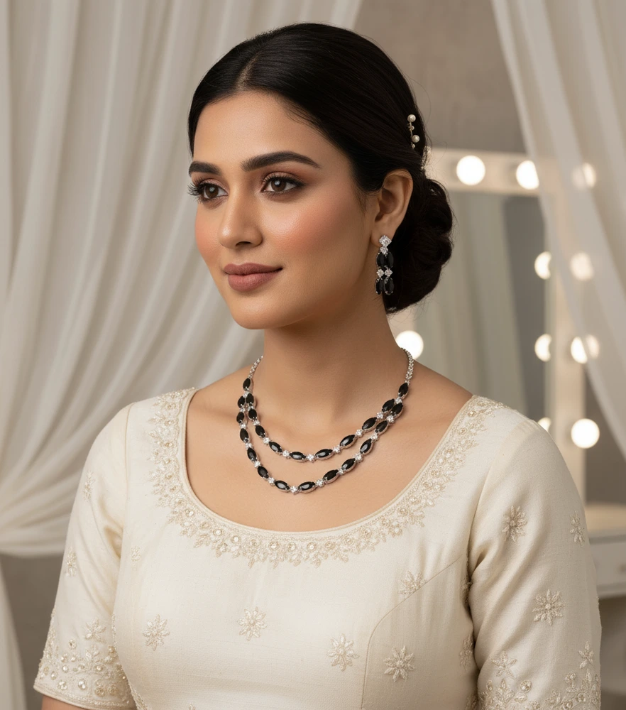 Add a touch of timeless charm to your style with this elegant black crystal double-layer necklace set. Perfect for weddings, festive events, and evening parties, this imitation jewellery set beautifully combines bold black stones with shimmering silver accents for a luxurious look.