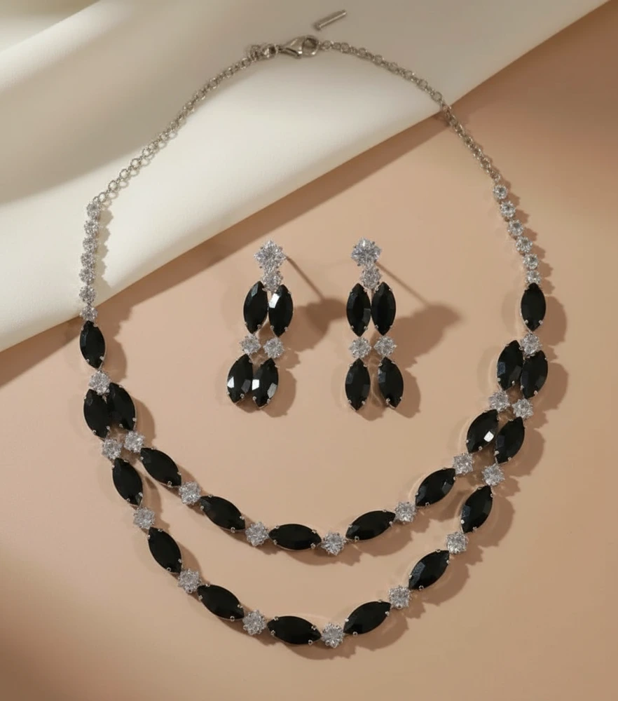 Be the first to review “Elegant Black Crystal Double Layer Necklace Set with Silver Finish”