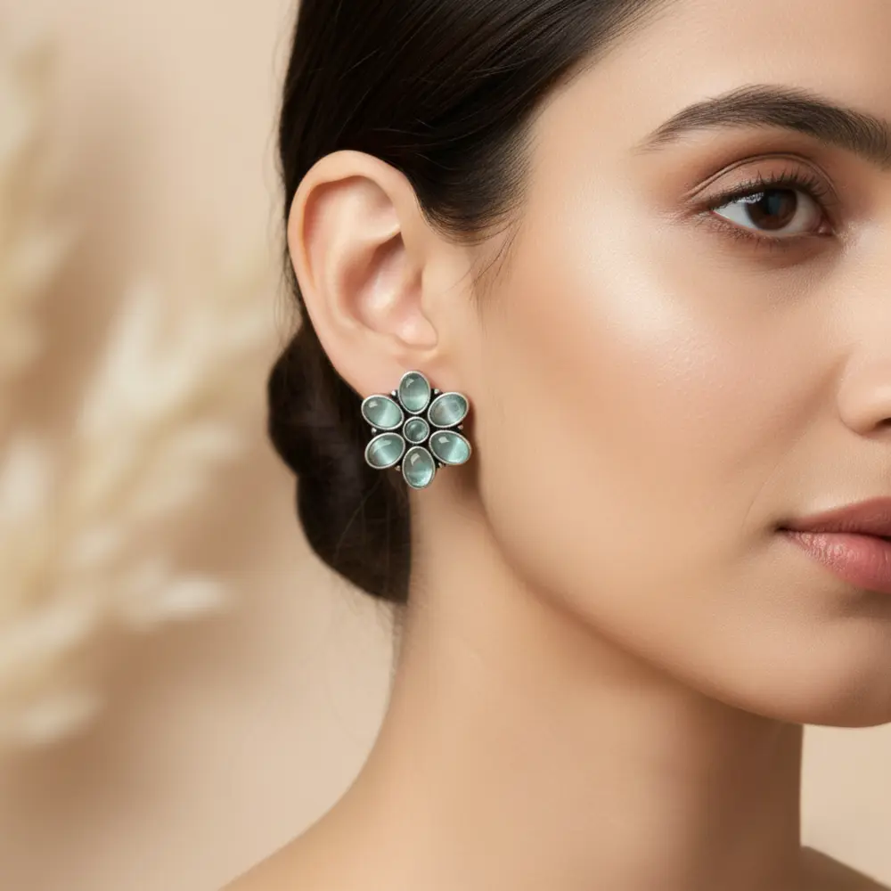 These Elegant Floral Light Blue Stone Stud Earrings by Swarali Fashion redefine grace and sophistication. Designed in a delicate floral pattern, each petal features finely cut light blue stones that radiate a soft glow, creating a timeless and classy appearance. The silver-toned base complements the stone color beautifully, offering a perfect balance of subtlety and shine.