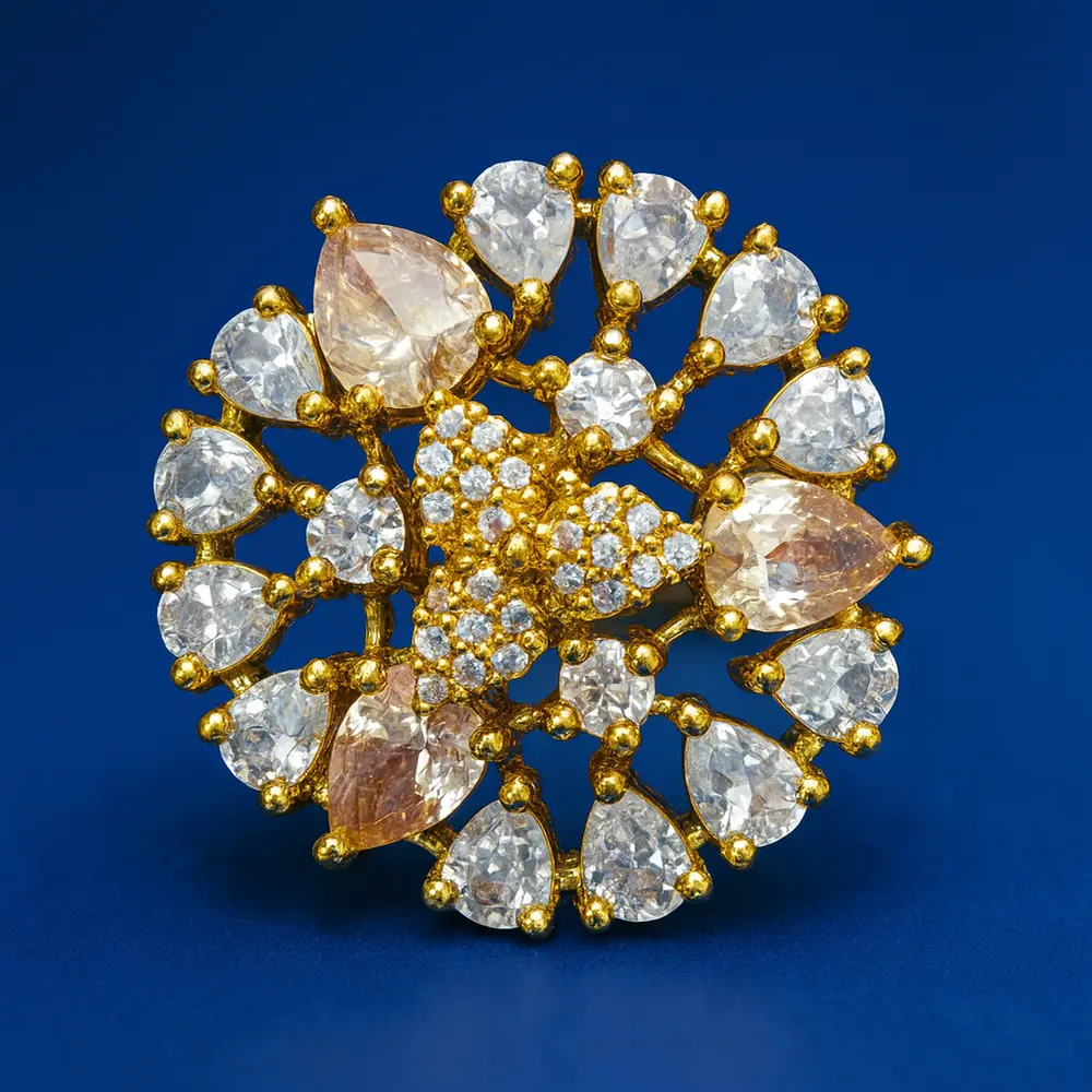 The ring features high-quality imitation diamonds set in a golden floral design, reflecting unmatched brilliance and grace. Perfect for brides, party wear, or festive celebrations, this stunning piece blends traditional artistry with a modern touch.