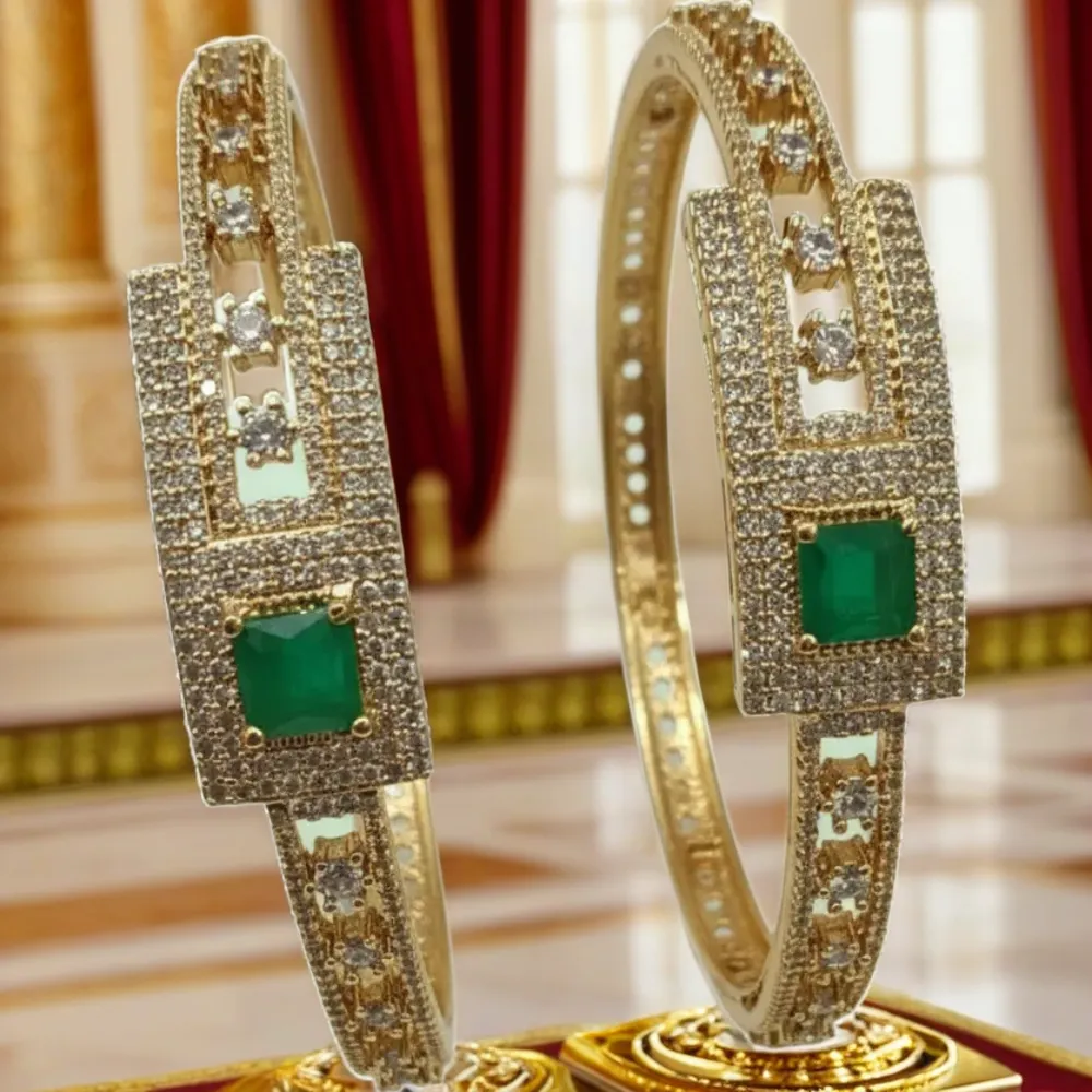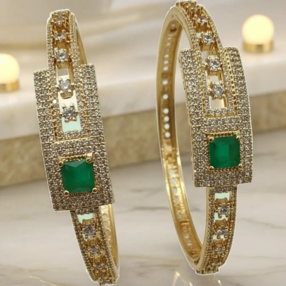 Stylish gold-plated bangles adorned with green and white stones, perfect for festive, wedding, and party wear. Lightweight, premium finish, and comfortable to wear all day.