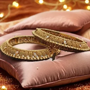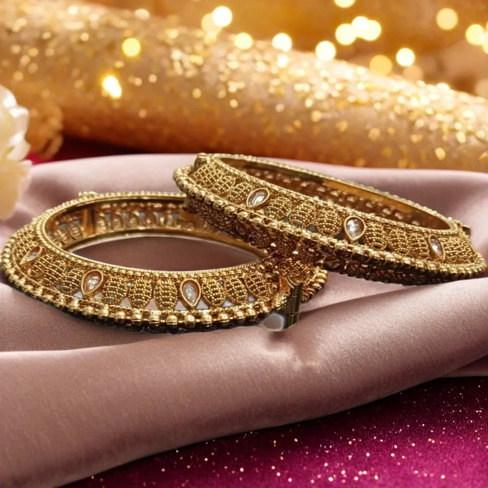 These bangles feature intricate handcrafted detailing, adorned with Kundan-inspired embellishments that shimmer beautifully under any light. Made from premium-quality imitation metal with a long-lasting gold polish, these bangles are ideal for pairing with sarees, lehengas, or salwar suits.