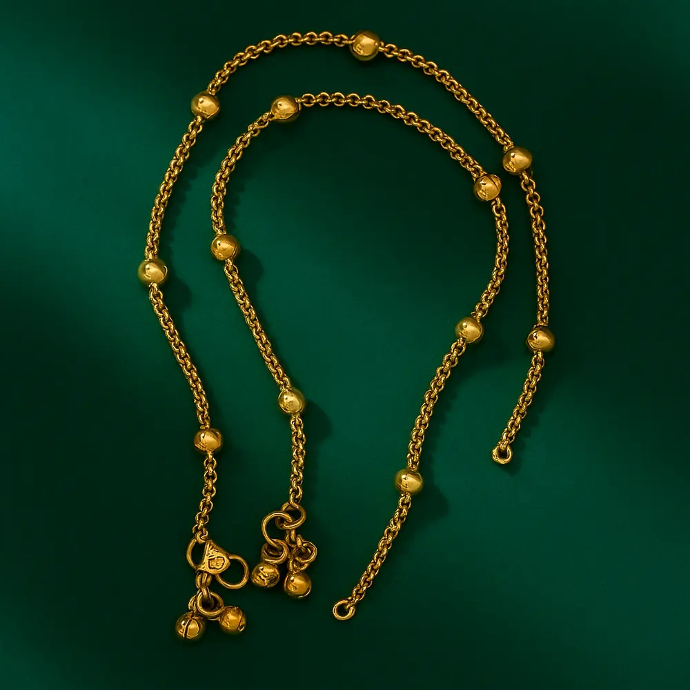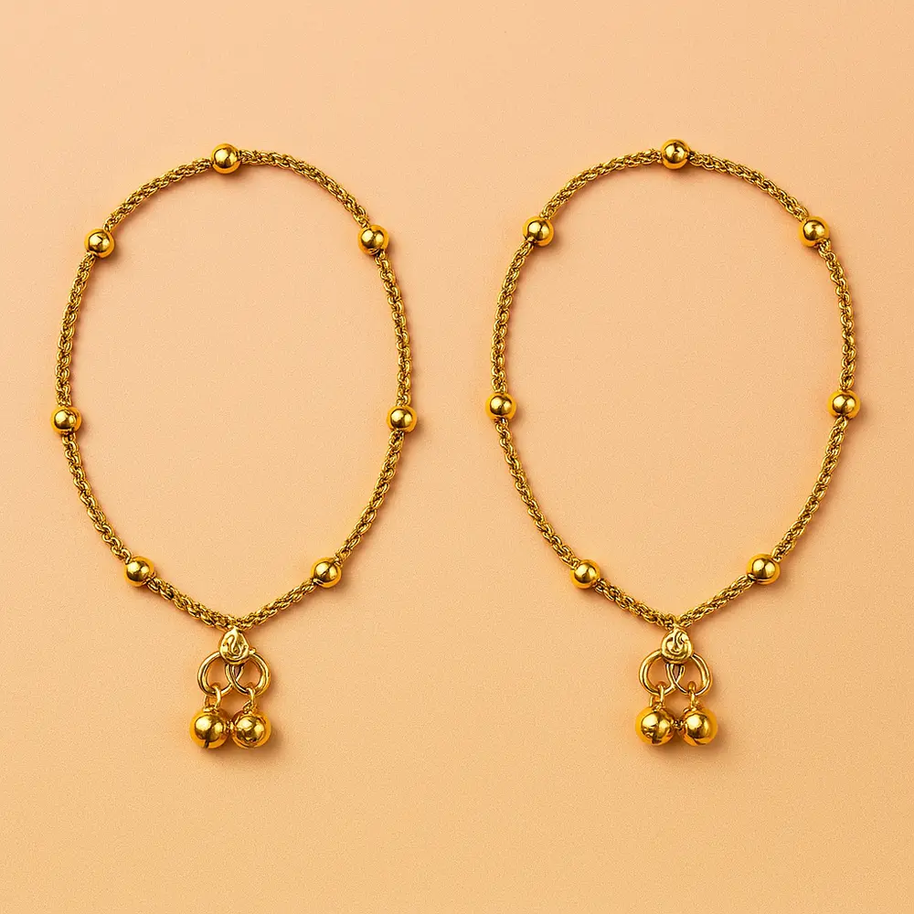 Elegant gold-tone beaded anklet with ghungroo charms, crafted from premium imitation metal. Perfect blend of tradition and modern grace — ideal for festive and daily wear.