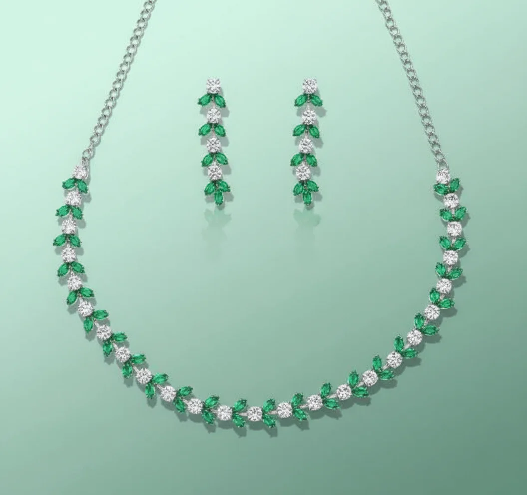 This imitation jewellery set combines the beauty of green gemstones with the brilliance of diamonds, offering the elegance of fine jewellery at an affordable price. Made with high-quality, skin-friendly materials, this lightweight set ensures comfort and durability.