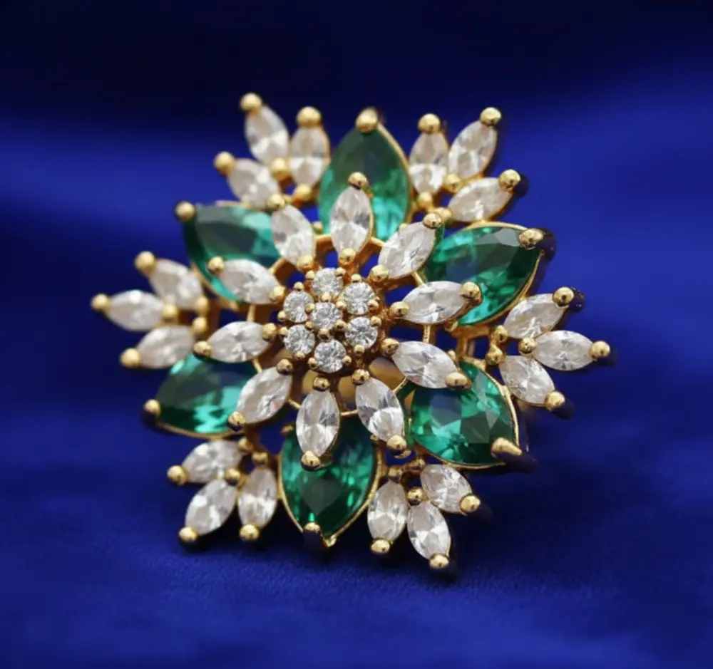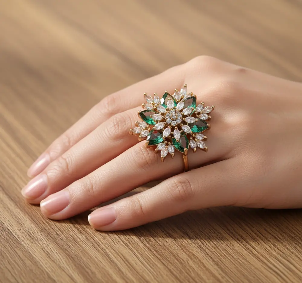 This stunning ring features a floral-inspired design crafted with shimmering white cubic zirconia stones and emerald-green crystals, all set in a premium gold-plated base.