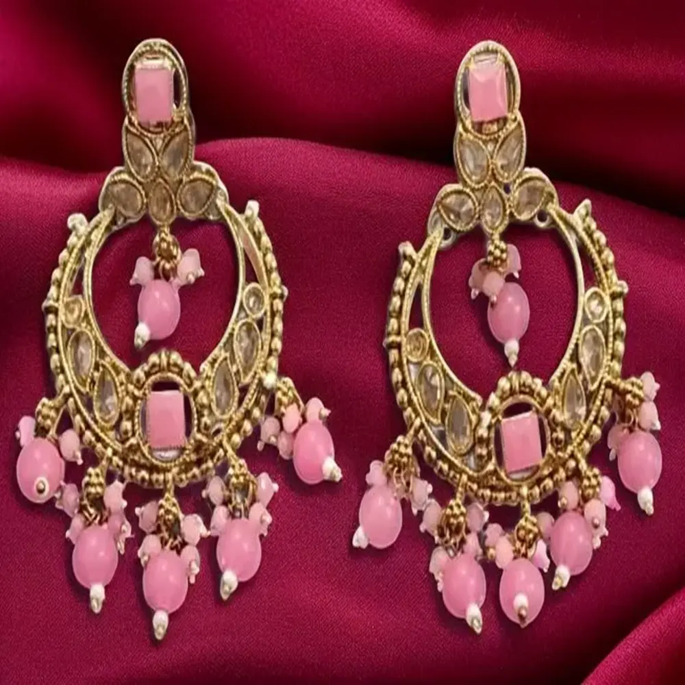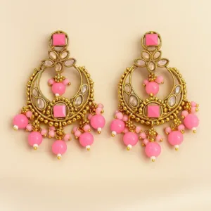Crafted with precision, these earrings feature intricate gold-tone metal work embellished with premium Kundan stones and elegant pink beads. The crescent design symbolizes grace and femininity, making it ideal for festive wear, weddings, and special occasions.