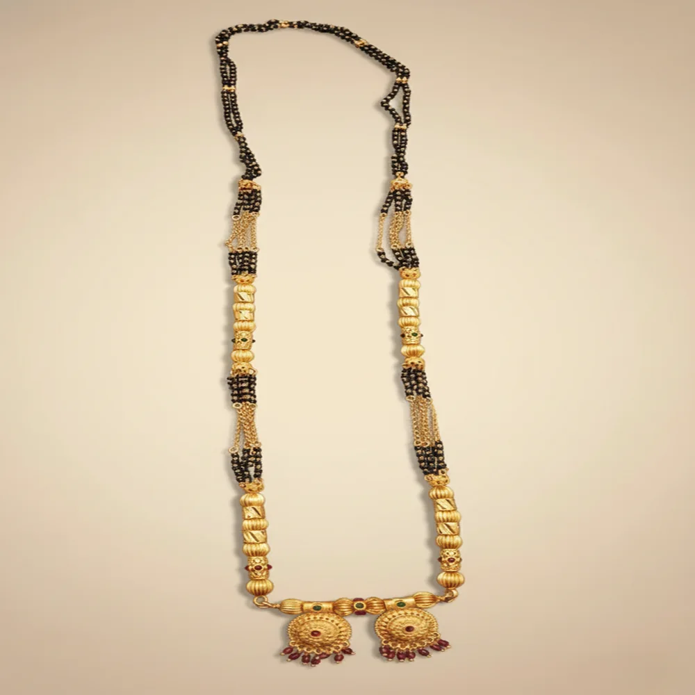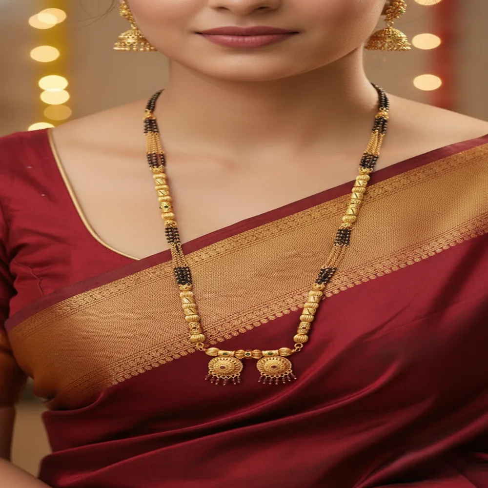 The gold-plated finish radiates luxury, while the fine craftsmanship ensures durability and long-lasting shine. Lightweight and comfortable, this Mangalsutra beautifully complements ethnic outfits like sarees, salwar suits, and lehengas.