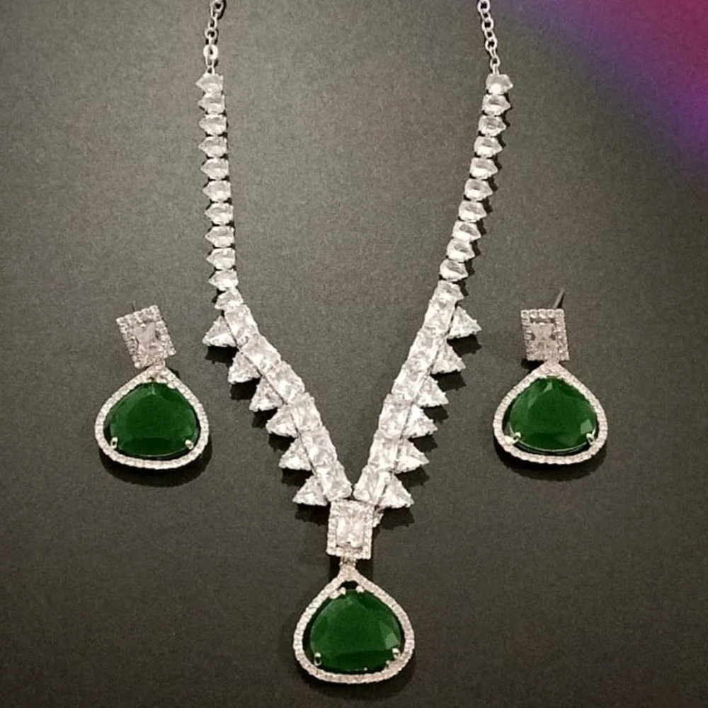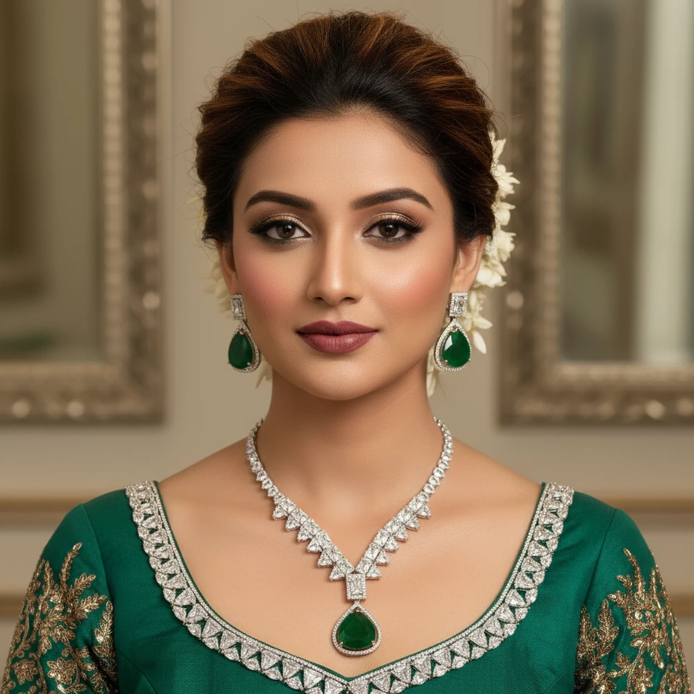 Step into luxury with this Emerald Green Diamond-Cut Imitation Necklace Set, exclusively from Swarali Fashion. Designed with precision and passion, this elegant jewellery set features a dazzling combination of green emerald-style stones surrounded by sparkling white crystals that create a regal and graceful appeal.
