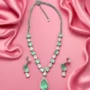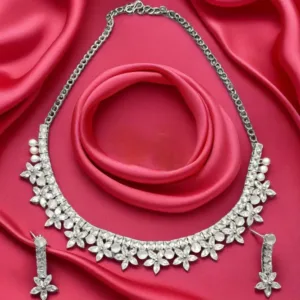 Crafted with precision in a high-quality silver finish, it comes with matching earrings that enhance its luxurious appeal. Ideal for brides, festive occasions, evening parties, and formal gatherings, this jewellery set blends modern charm with traditional finesse.