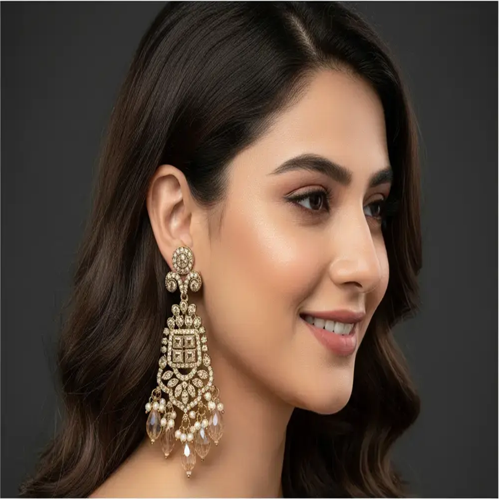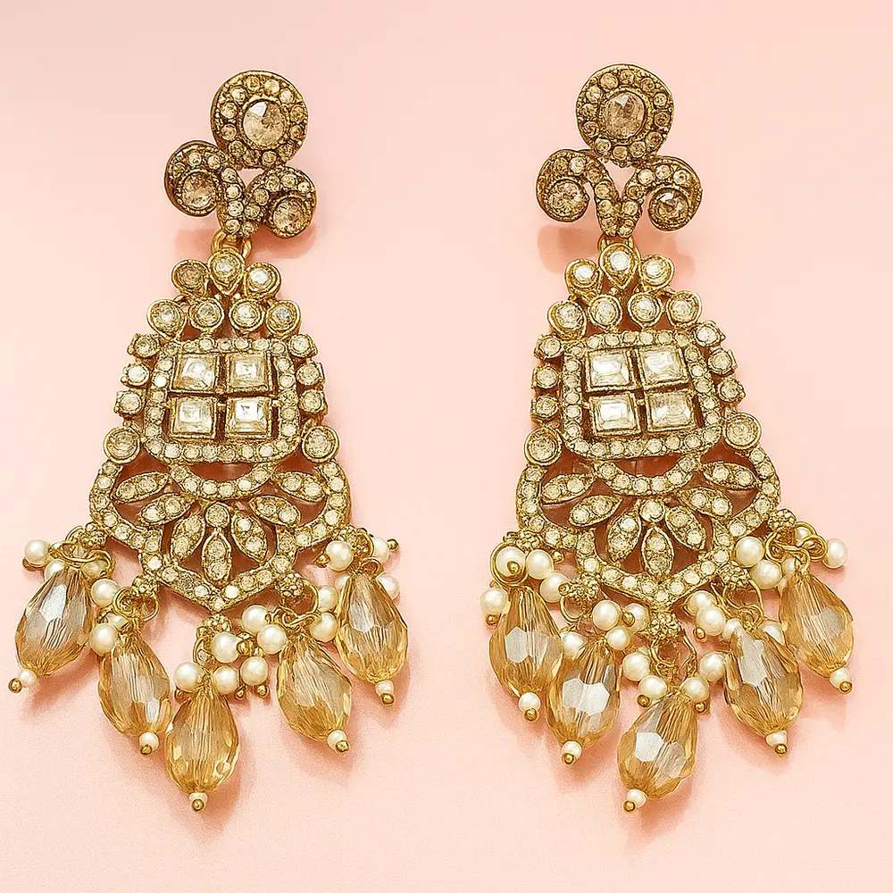 The finely detailed craftsmanship reflects traditional artistry, making it ideal for weddings, parties, and cultural celebrations. Each earring features sparkling Kundan work paired with hanging beads and crystal drops that elevate your entire outfit with effortless elegance.