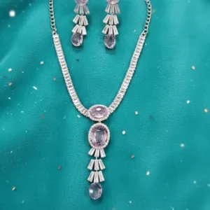 Introducing the Lavender Crystal Stone Necklace Set from Swarali Fashion, a symbol of elegance and timeless beauty. This stunning imitation jewellery set features shimmering lavender stones set in a refined silver-toned base. The necklace’s intricate design is paired with beautifully crafted matching earrings, creating a sophisticated and graceful look.
