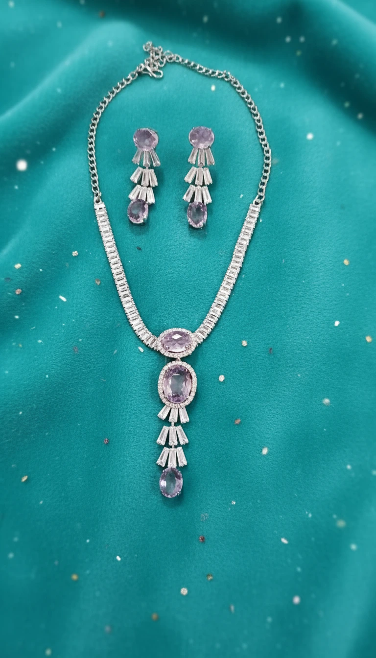 Add a royal touch to your style with this Lavender Crystal Stone Necklace Set from Swarali Fashion. Featuring a delicate chain and matching earrings, this imitation jewellery enhances your beauty for weddings, receptions, and festive occasions.