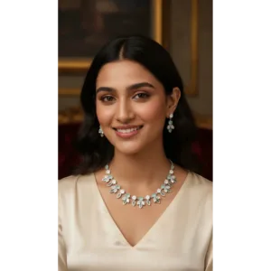 The coordinated earrings complete its delicate and elegant aesthetic, making it perfect for weddings, festive celebrations, and elegant evening wear. Lightweight and durable, this set pairs beautifully with sarees, lehengas, and gowns, reflecting refined craftsmanship and luxury.