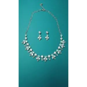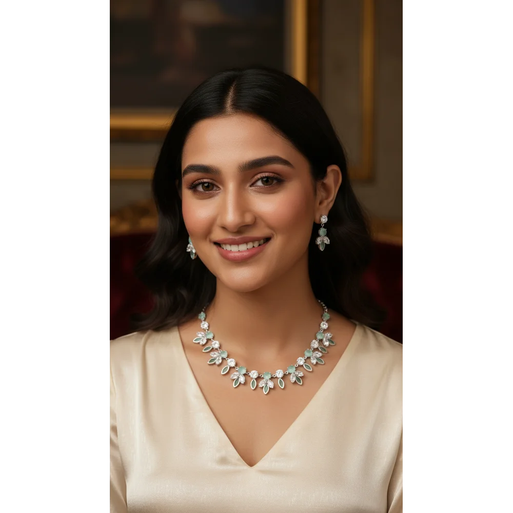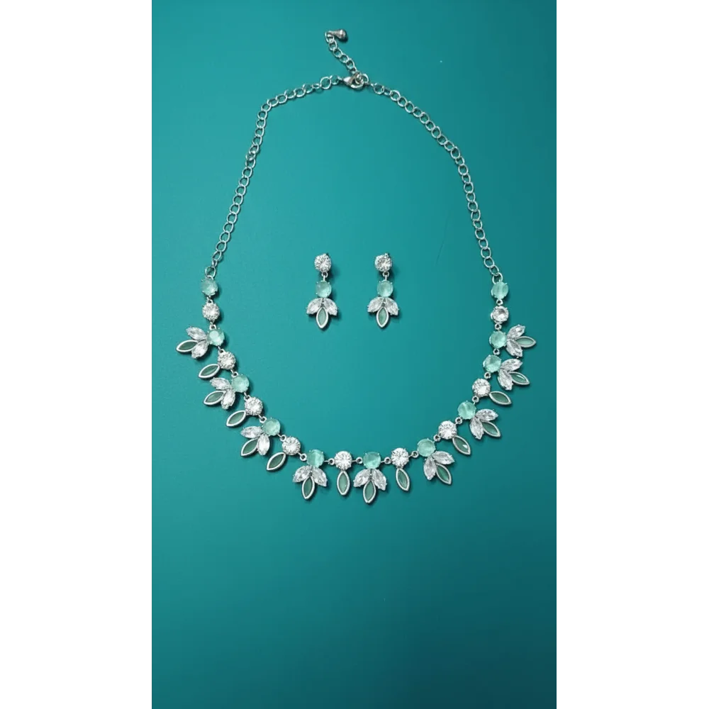 Elegant mint green crystal floral necklace set by Swarali Fashion, designed with shimmering white stones and a silver finish. This imitation jewellery adds grace and charm — ideal for weddings, festive occasions, and parties.