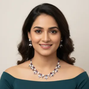 Step into timeless glamour with Swarali Fashion’s Purple Stone and Diamond Floral Necklace Set, an exquisite imitation jewellery piece crafted for women who love to shine with sophistication.