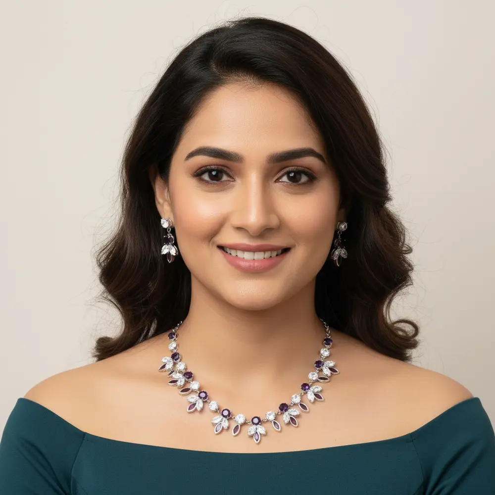 This stunning necklace features vibrant purple stones intricately paired with brilliant white diamond-cut crystals in a floral pattern, exuding charm and grace. The elegant design is completed with matching drop earrings, creating a coordinated and luxurious look suitable for weddings, parties, and festive occasions.