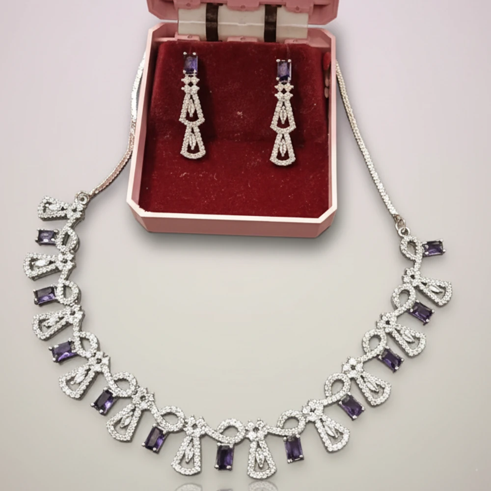 Bring timeless sophistication to your look with the Purple Stone Diamond-Cut Necklace Set from Swarali Fashion. This beautifully handcrafted imitation jewellery set features sparkling diamond-cut stones and rich purple rectangular gems, perfectly arranged in a unique pattern for a luxurious appeal.
