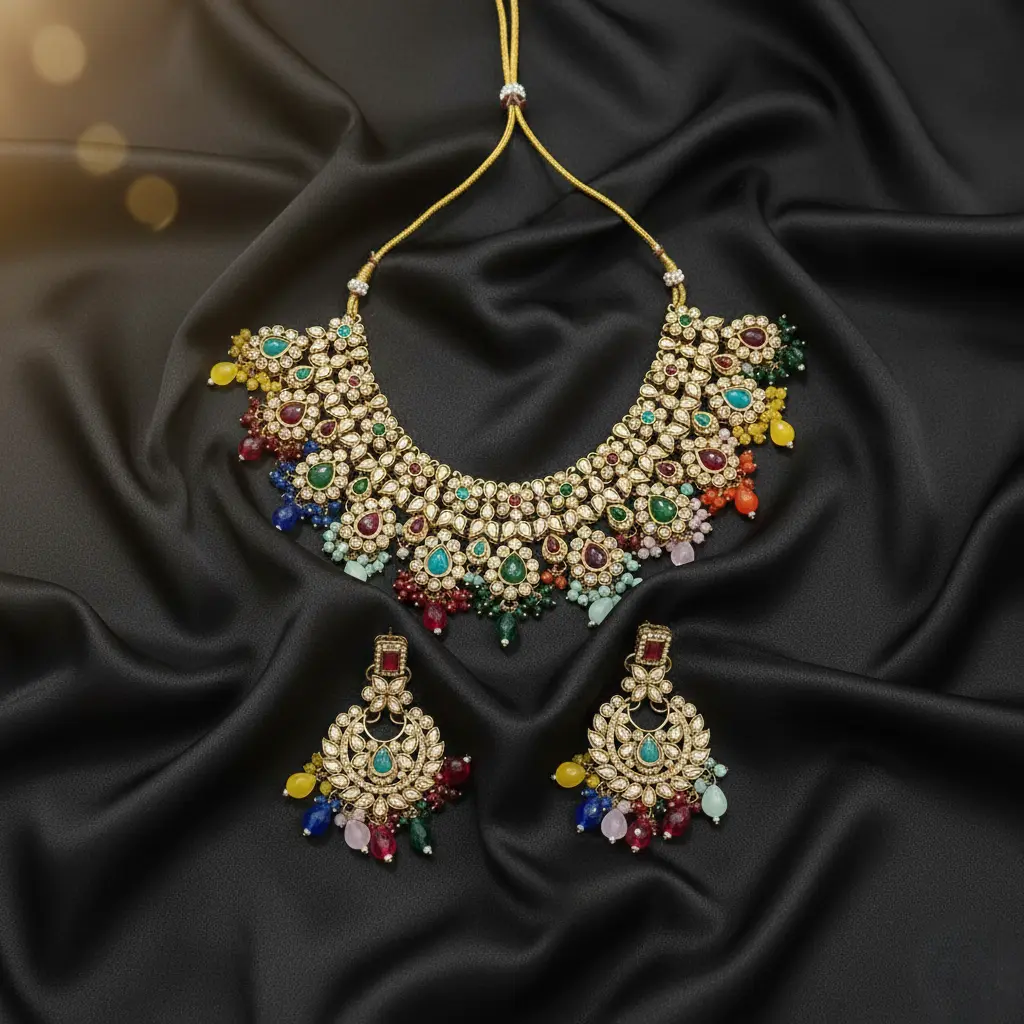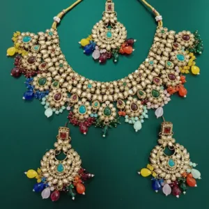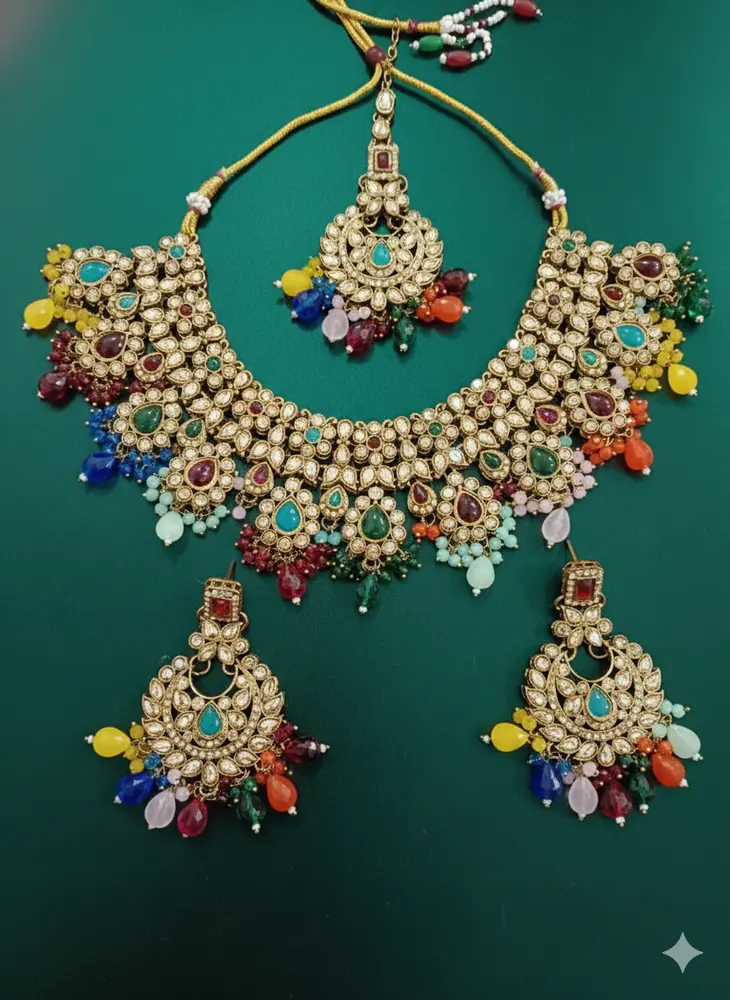 The elaborate design includes a choker-style necklace adorned with multicoloured beads and matching earrings that exude luxury and charm. Ideal for bridal wear, festive occasions, and traditional ceremonies, this set perfectly complements sarees, lehengas, and ethnic outfits. Its intricate craftsmanship, brilliant shine, and comfortable fit make it a timeless statement piece.