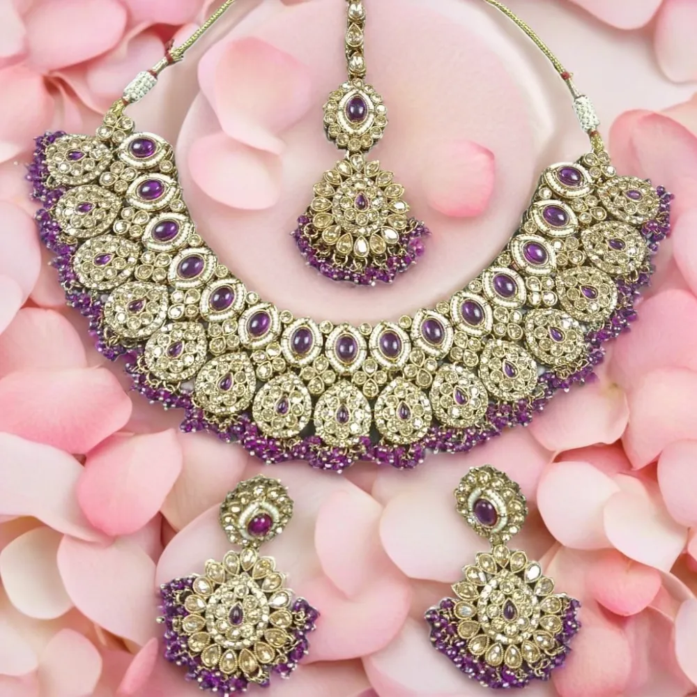 Royal Purple Kundan Bridal Necklace Set with Earrings & Maang Tikka