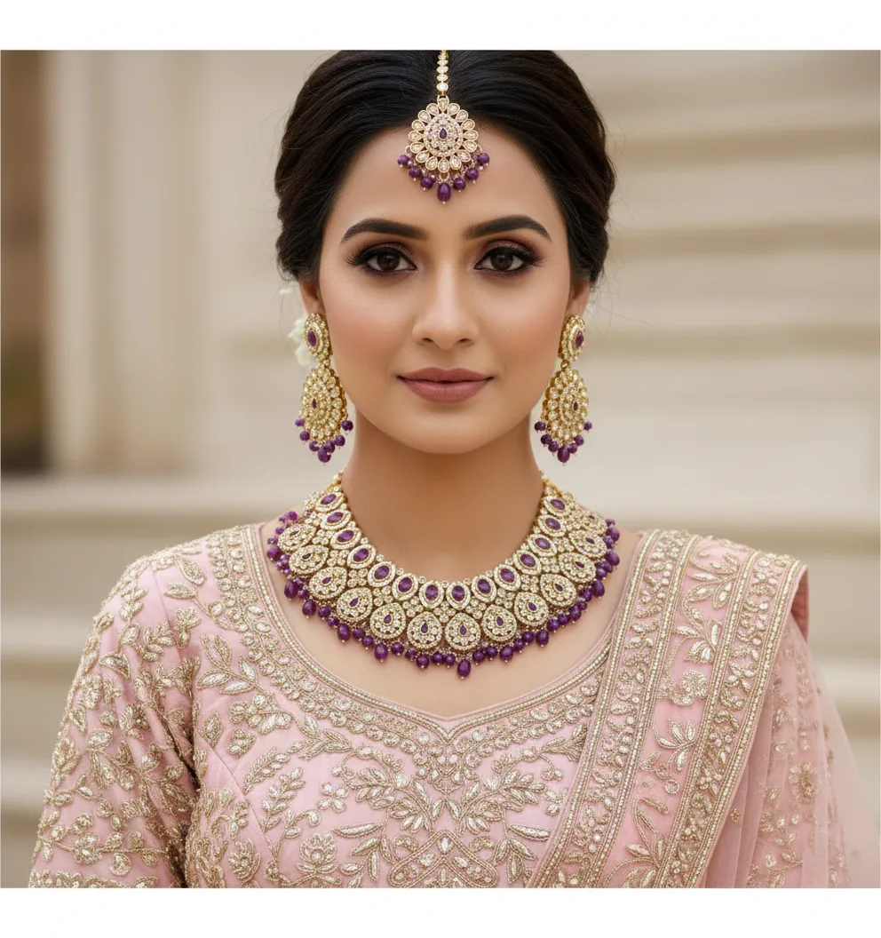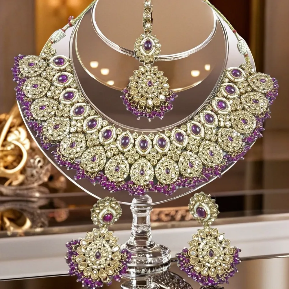 Whether paired with a lehenga, saree, or gown, this Royal Purple Kundan Bridal Set radiates elegance and sophistication — making you the center of attention at any celebration.