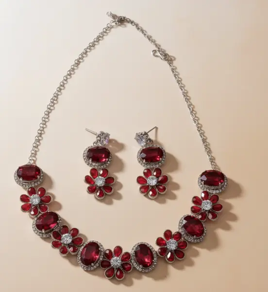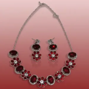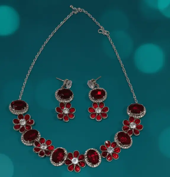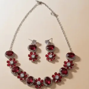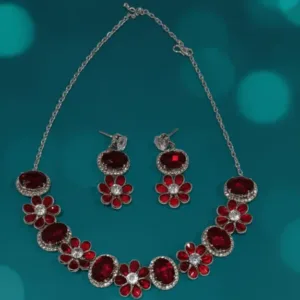Elevate your style with the exquisite Ruby Red Floral Necklace Set from Swarali Fashion. Crafted with precision, this imitation jewellery features radiant ruby-red stones and shimmering white crystals arranged in a delicate floral pattern. The silver-finish chain enhances the brilliance of the stones, creating a captivating blend of modern charm and traditional grace. Ideal for weddings, parties, and festive celebrations, this necklace set adds a luxurious touch to ethnic and contemporary outfits alike.