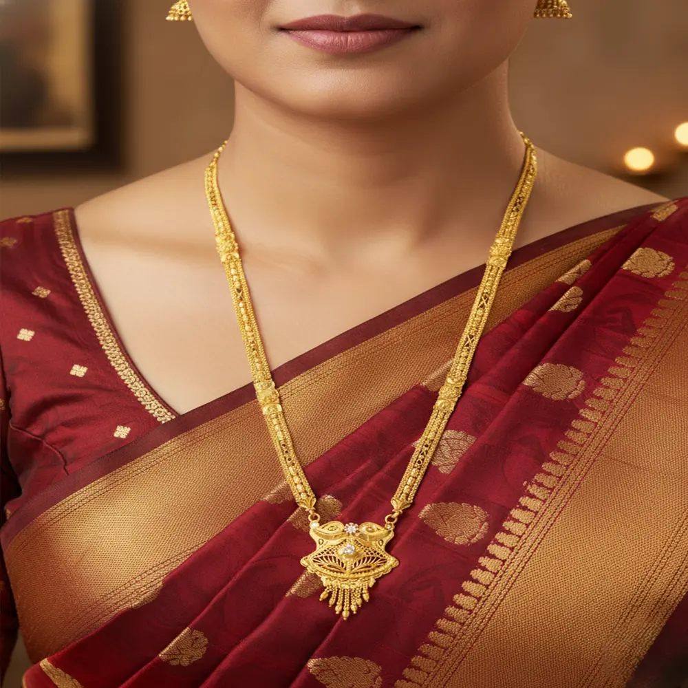 Embrace the timeless beauty of tradition with this exquisite Maharashtrian Long Gold-Plated Mangalsutra by Swarali Fashion. Expertly crafted with intricate detailing, this imitation jewellery piece captures the elegance of authentic gold craftsmanship while offering superior durability and shine.