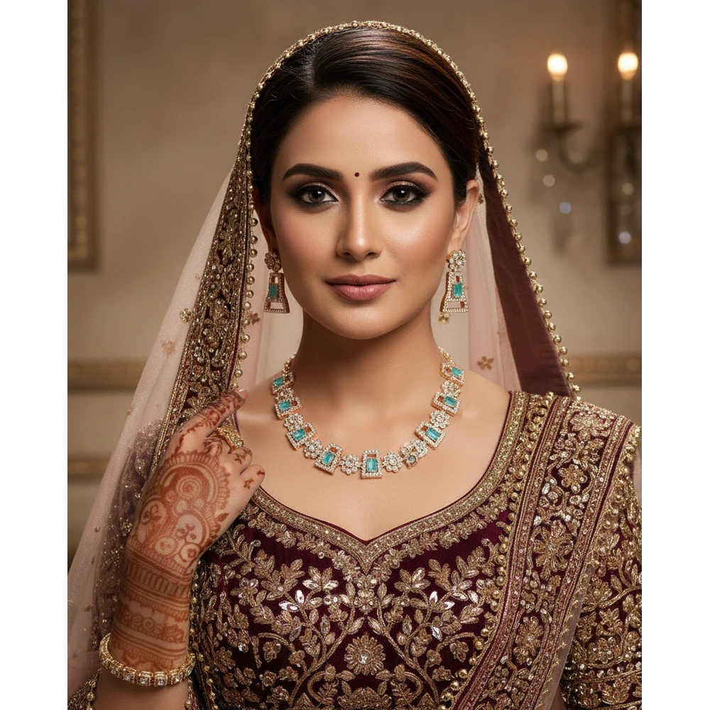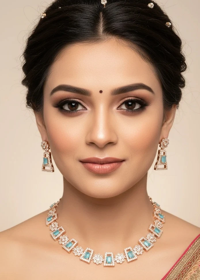 Add a touch of luxury with this elegant turquoise blue and diamond-cut rose gold necklace set from Swarali Fashion. Paired with matching earrings, this imitation jewellery is perfect for weddings, festive occasions, and party wear looks.