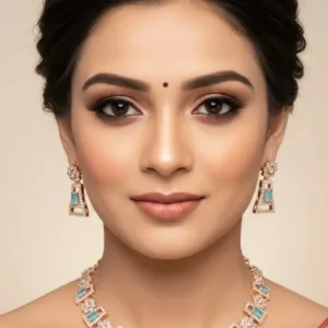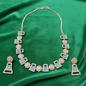 Elevate your style with the Turquoise Blue and Diamond-Cut Rose Gold Necklace Set by Swarali Fashion. Crafted with precision, this imitation jewellery set features striking turquoise blue rectangular stones surrounded by brilliant diamond-cut crystals, all set on a refined rose gold base.